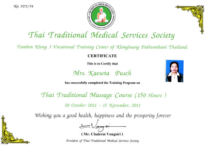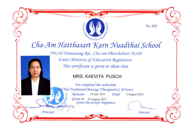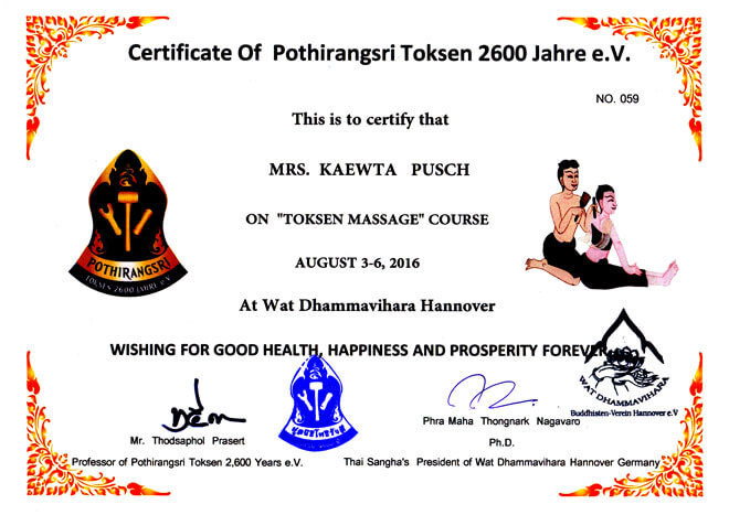 | Zertifikate Wir bilden uns ständig fort, damit wir immer auf dem neusten Stand sind, um Ihnen die bestmöglichen Massagen & Therapien anzubieten. Unsere Fortbildungen finden direkt bei der "Thai Massage Medical School Wat Po" in Thailand statt. Für folgende Massagen haben wir ein Zertifikat erhalten: |